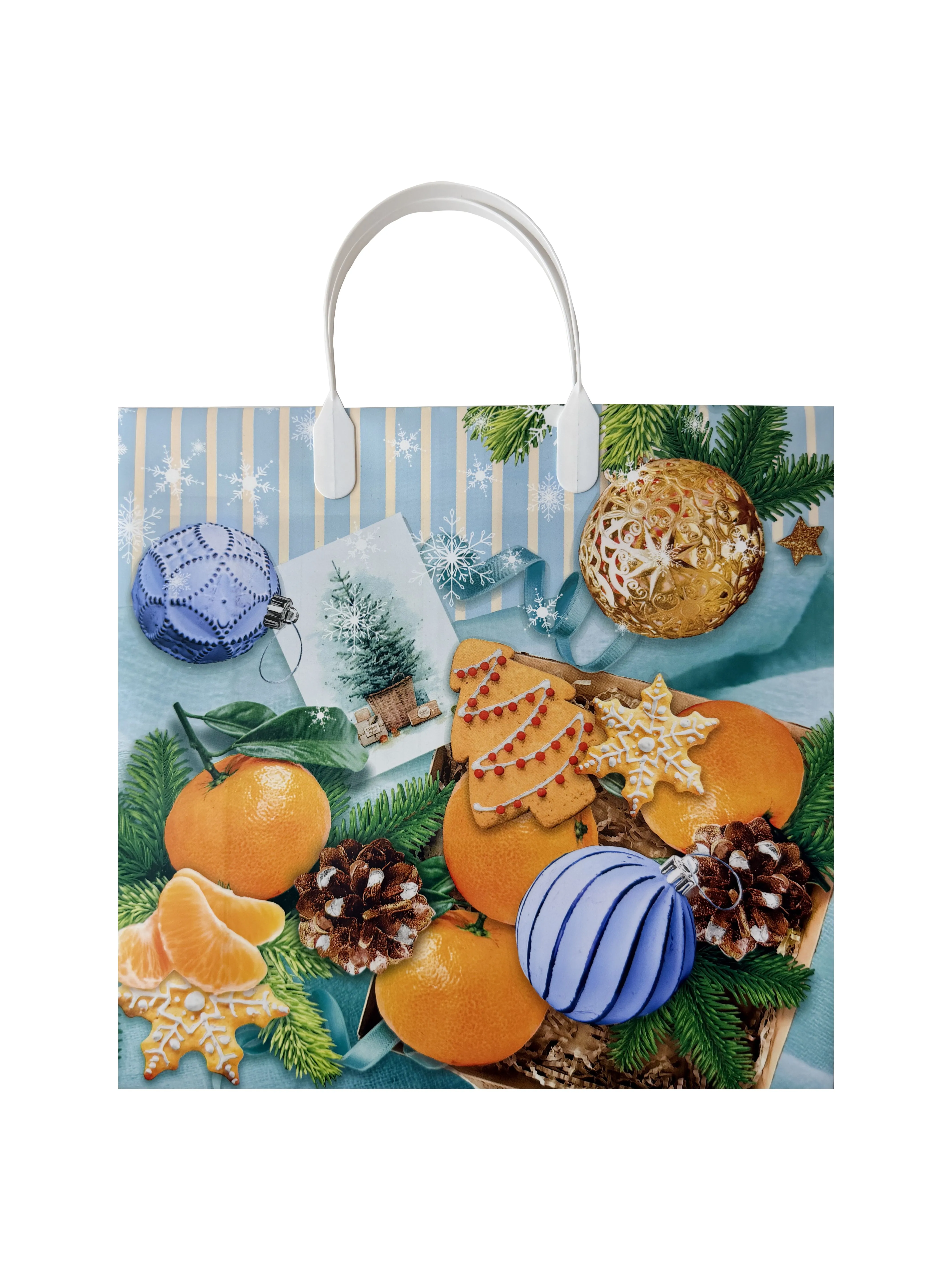 Пластиковый пакет с ручками имеет красивый рисунок, благодаря чему подойдет для преподнесения новогодних подарков.