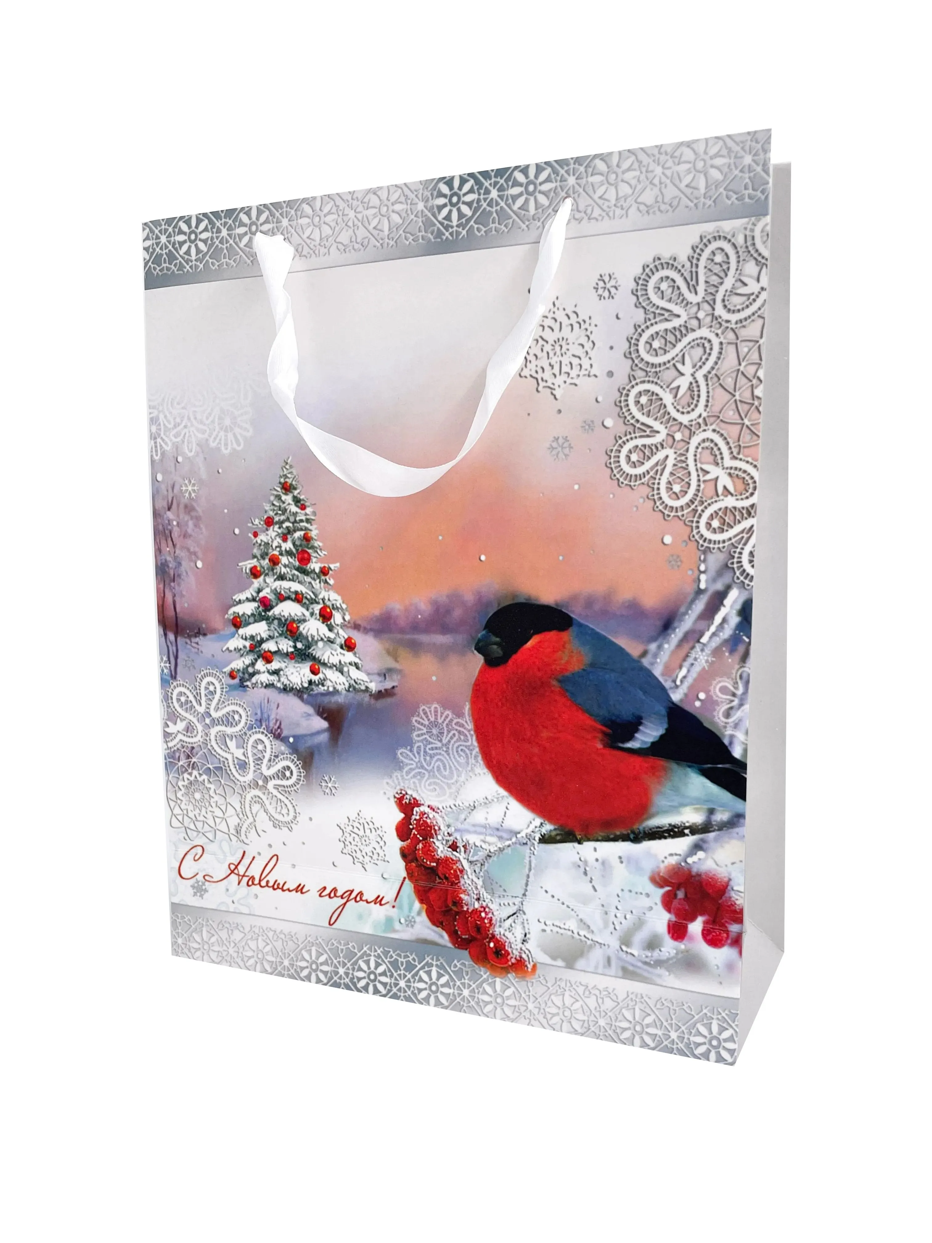 Бумажный ламинированный пакет имеет красивый рисунок, благодаря чему подойдет для преподнесения новогодних подарков.