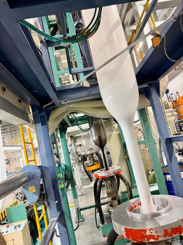 На фото показан процесс производства пленки из вторсырья.