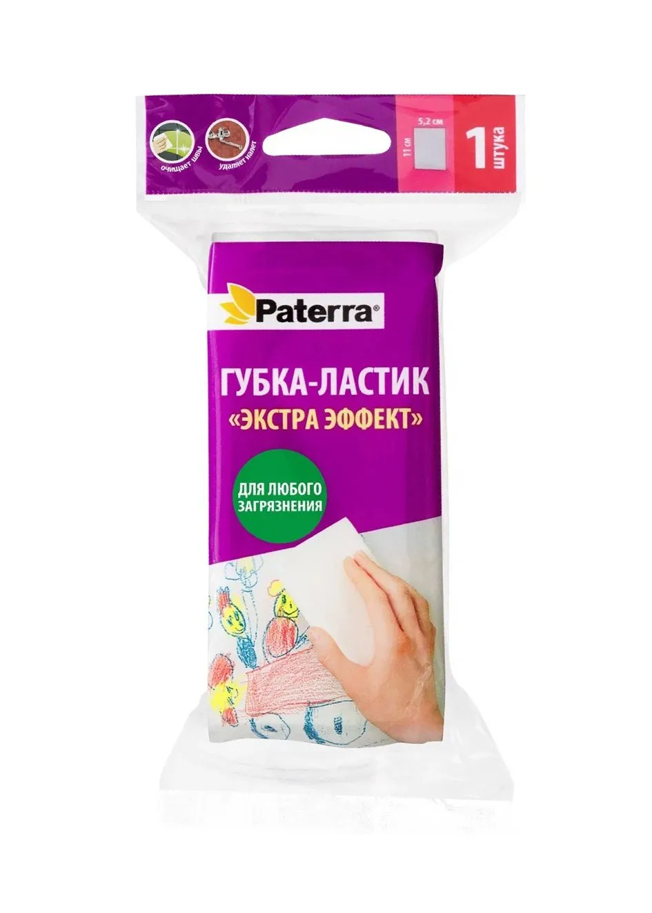 Инновационная губка Paterra работает по принципу "ластика"! Просто намочите ее холодной водой, слегка отожмите и потрите очищаемую поверхность.